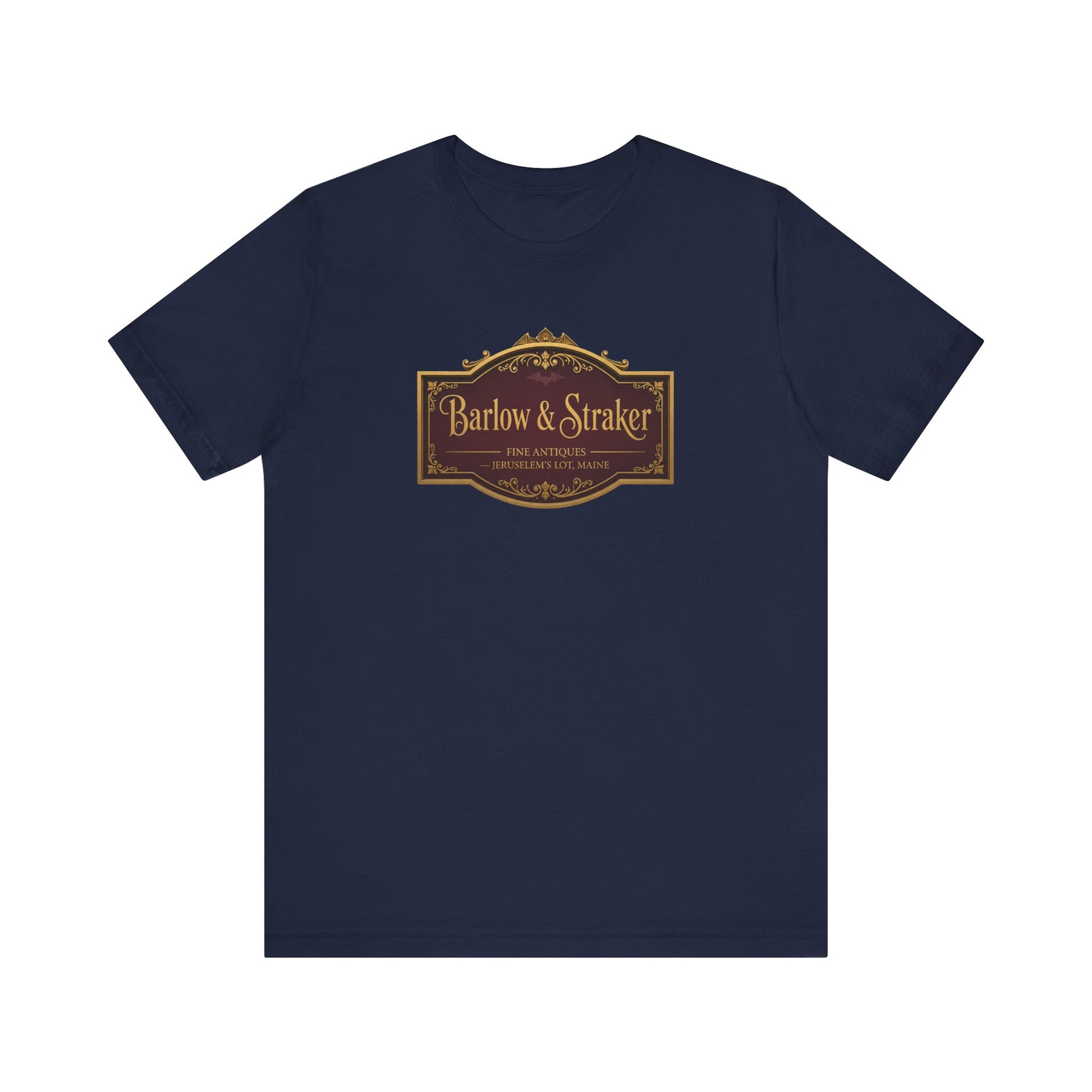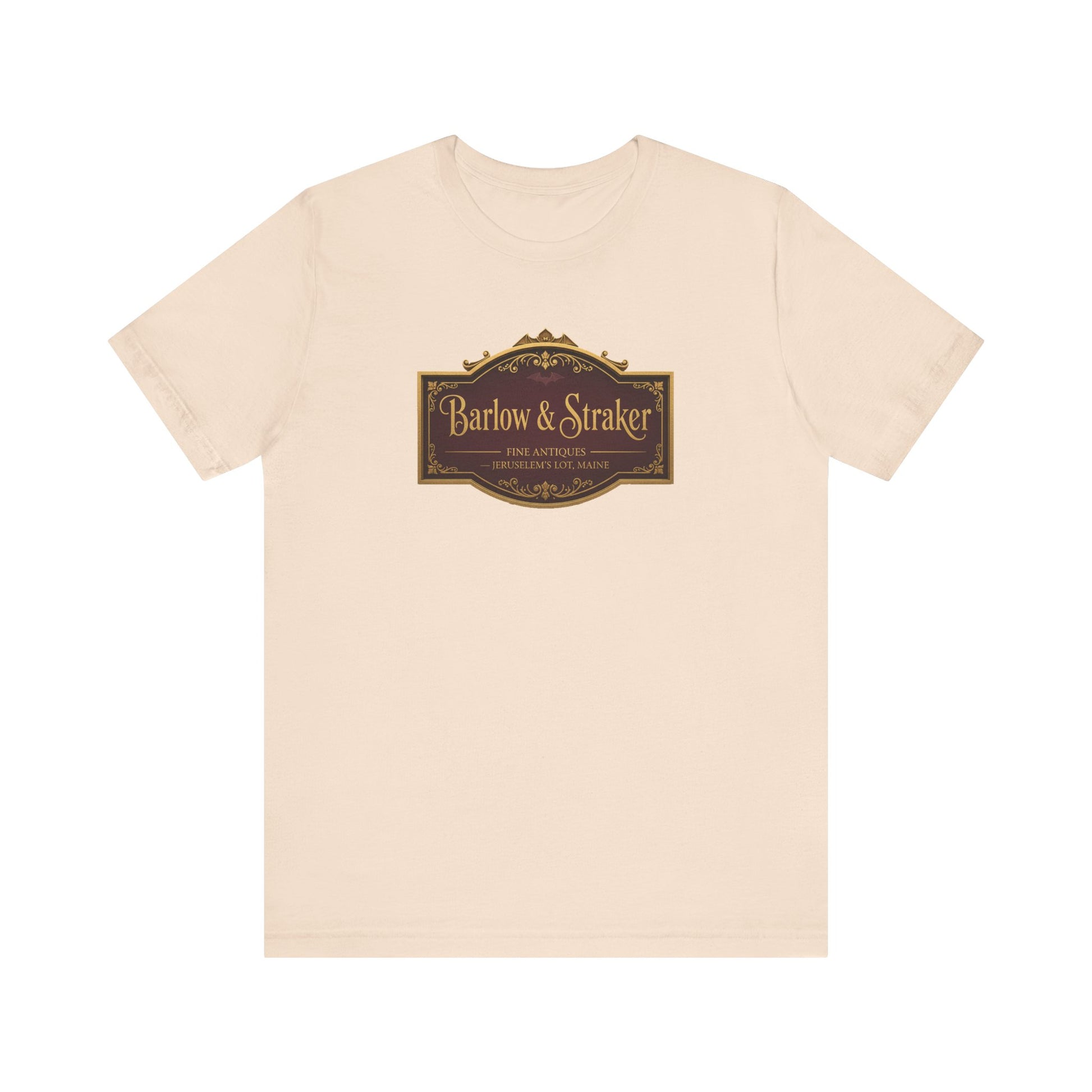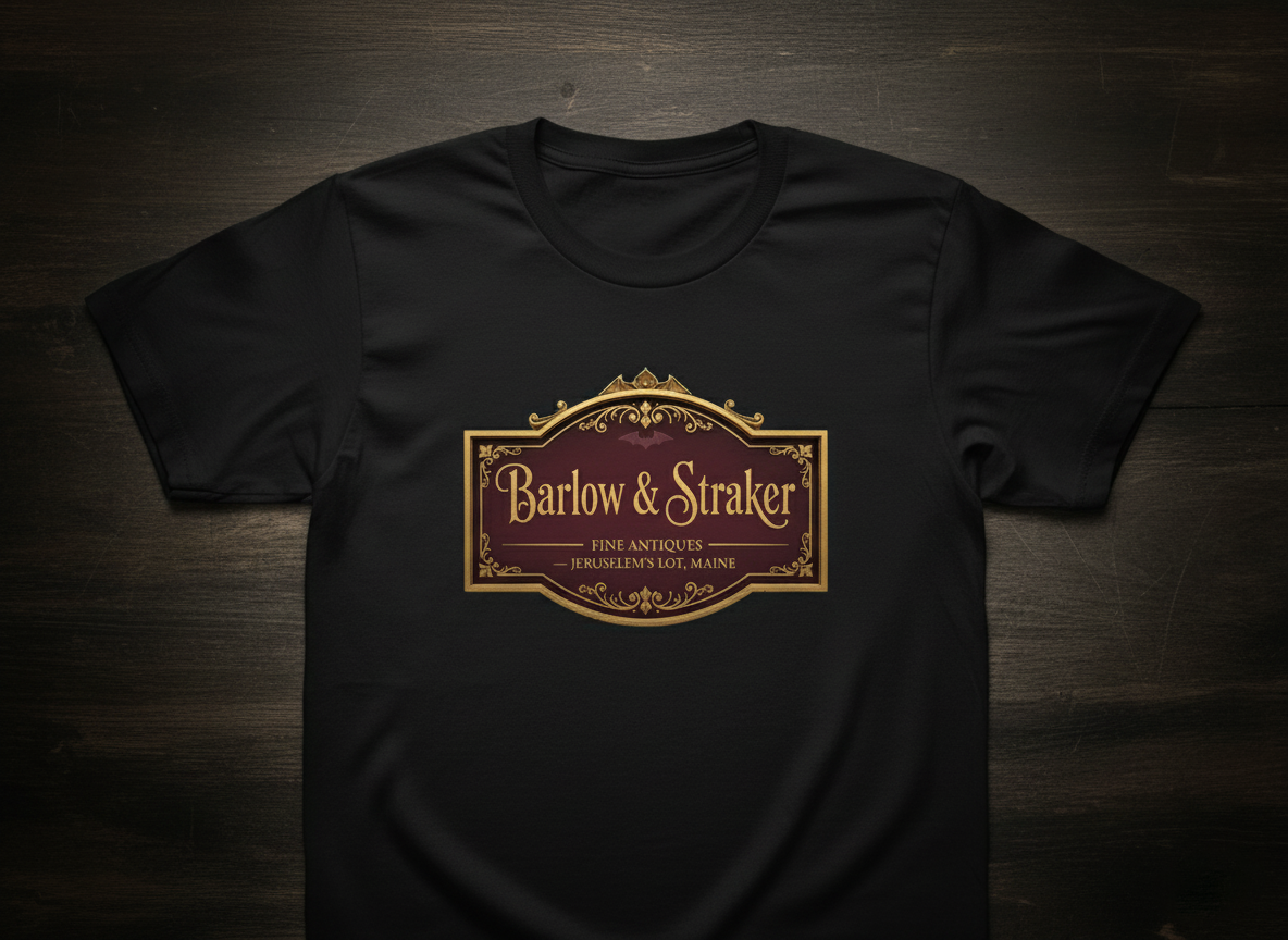 The StephenKingdom “Barlow & Straker Fine Antiques” T-Shirt pays tribute to the sinister charm of ’Salem’s Lot. Designed as a vintage shop sign from the fictional antique store on Jerusalem’s Lot Main Street, this piece combines gothic elegance with understated fandom — perfect for Constant Readers who appreciate the details only insiders catch.