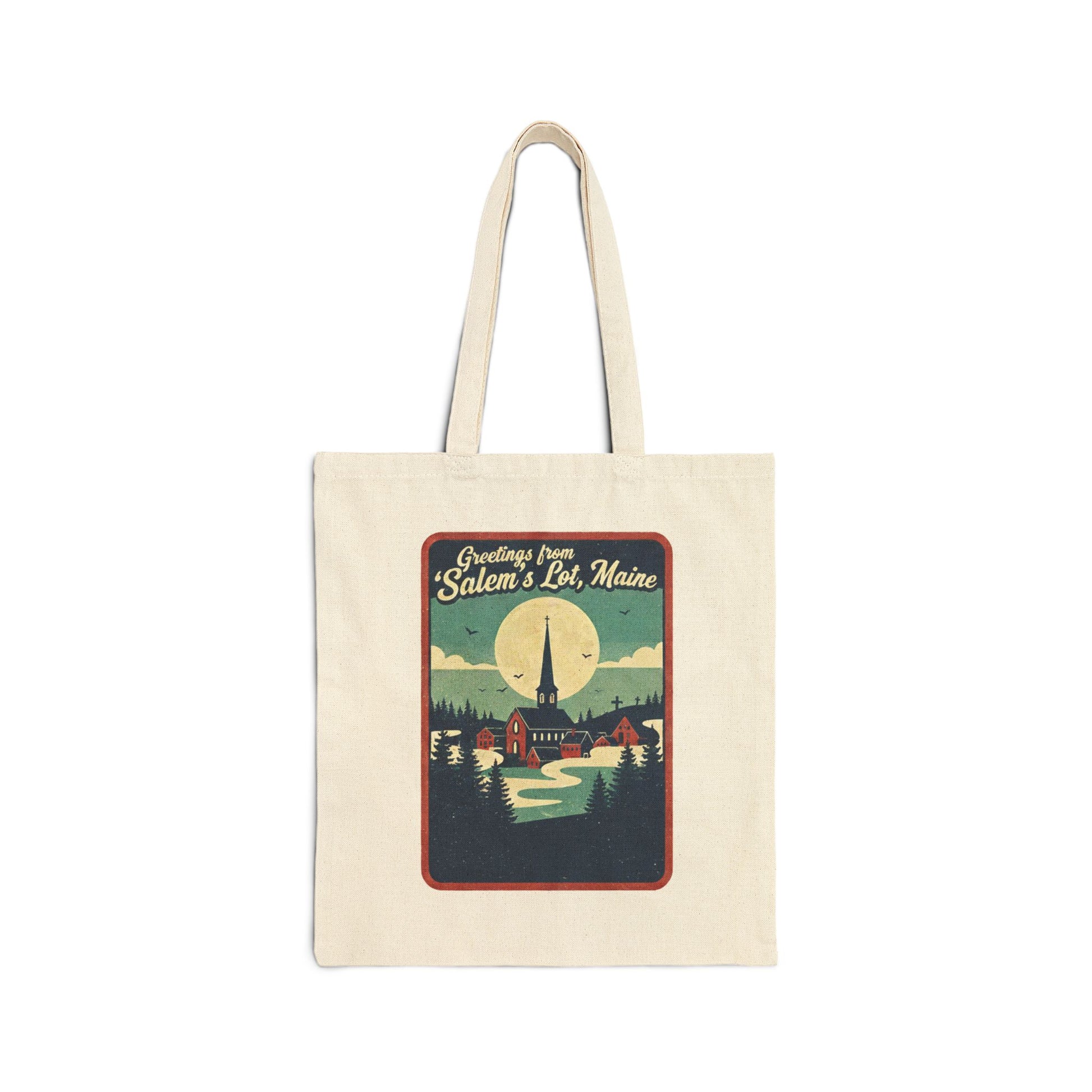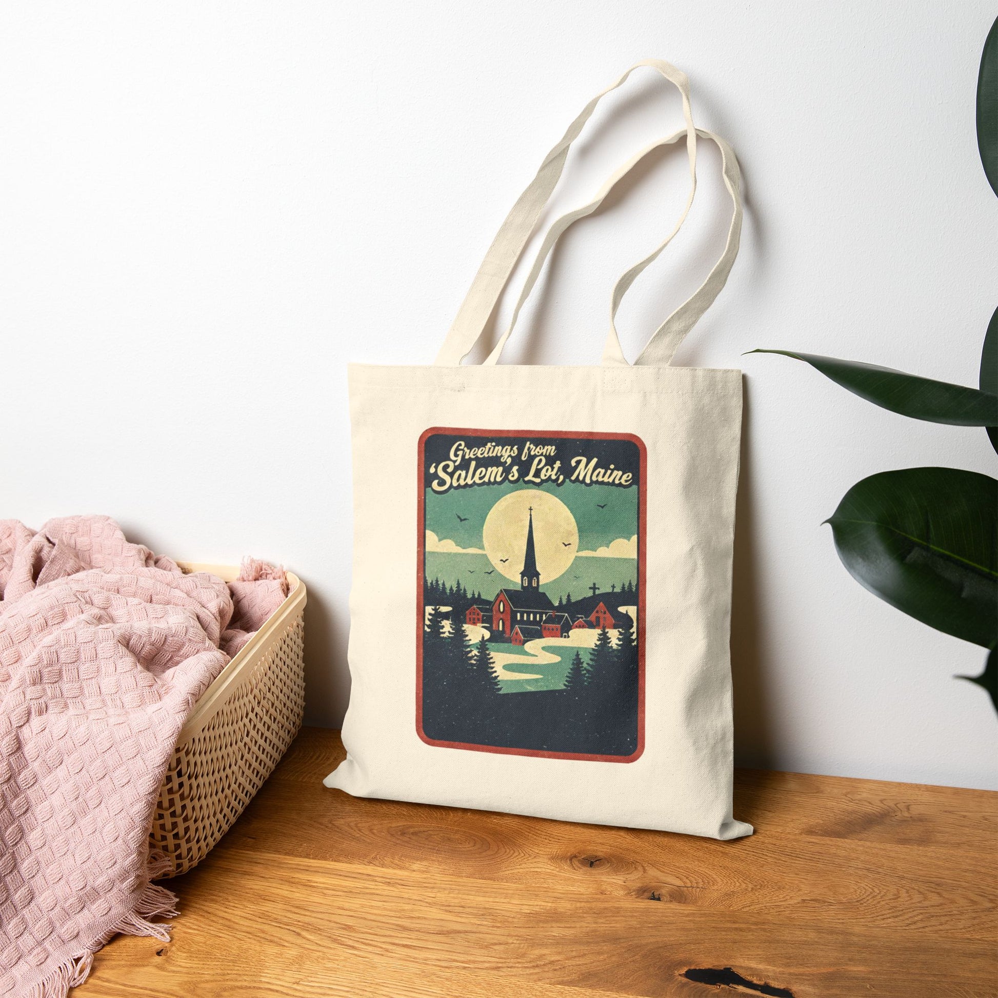 This durable cotton canvas tote is designed for everyday use, whether you’re packing library books, groceries, or your latest King re-read. The vintage-inspired “Greetings from” design features retro postcard lettering, subtle New England details, and a faint undercurrent of unease — a perfect balance of horror and charm.